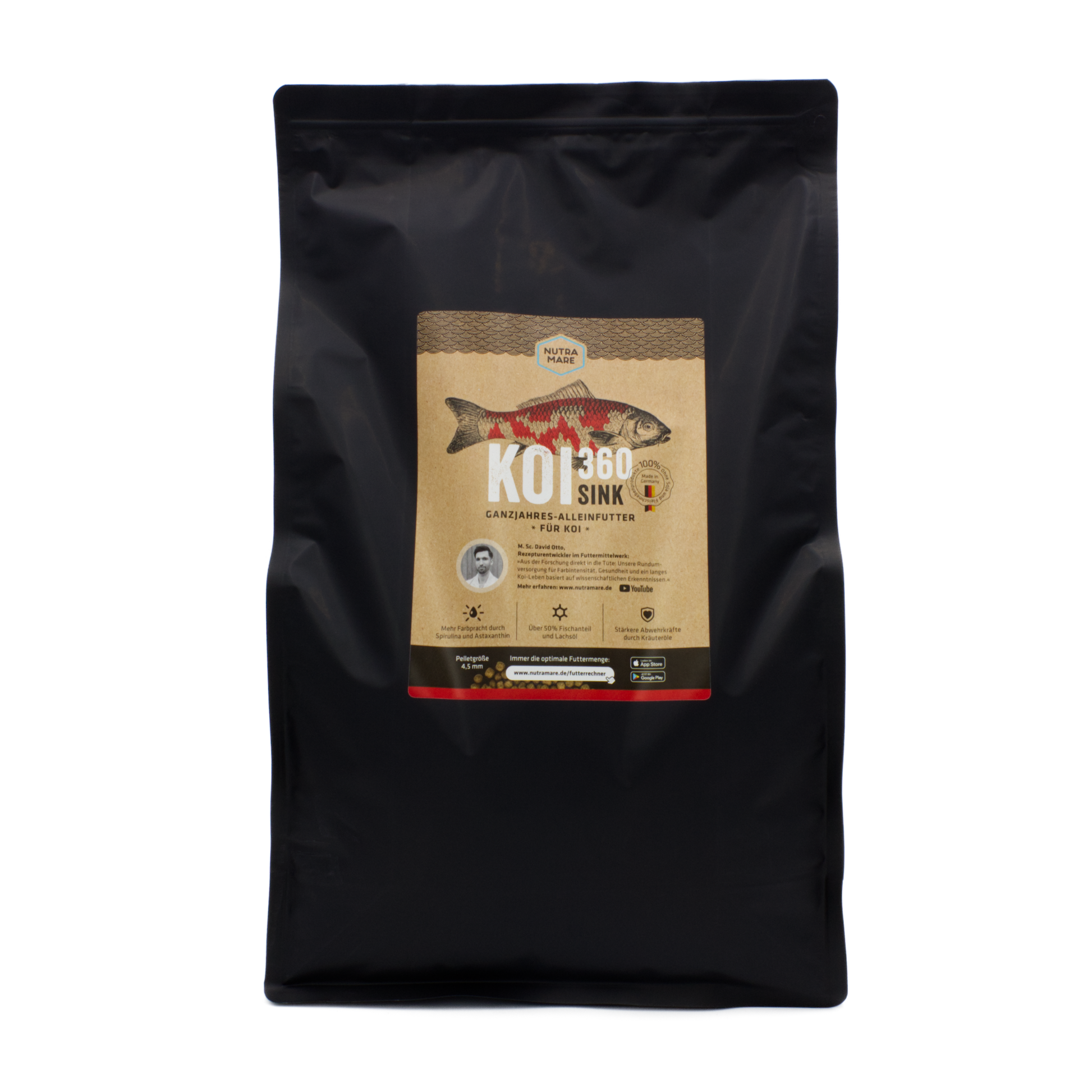 Unser Alleinfutter Nutramare Koi360 basiert auf den neuesten wissenschaftlichen Erkenntnissen und ist ernährungsphysiologisch auf die Bedürfnisse von Koi abgestimmt. Das optimale Protein-/Fett-Verhältnis sorgt für eine verbesserte Futterverwertung. Zusatzstoffe zur Unterstützung der Gesundheit wie Antioxidantien, Aktivton sowie Kräuteröle und Kräuter erhalten die Vitalität Ihres Fisches. Die Futterpellets mit einem Durchmesser von 4,5 mm sorgen für eine optimale Futteraufnahme und Rundumversorgung.